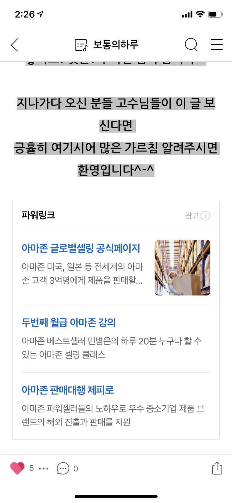 모바일에서 붙는광고는 블로그 포스팅 문맥에서 파악된 '아이템소싱,'아마존강의' 관련 광고가 노출되었는데
