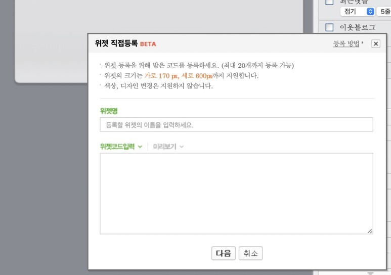 네이버 위젯은 가로 170px 세로 600px 까지 지원된다고 합니다.